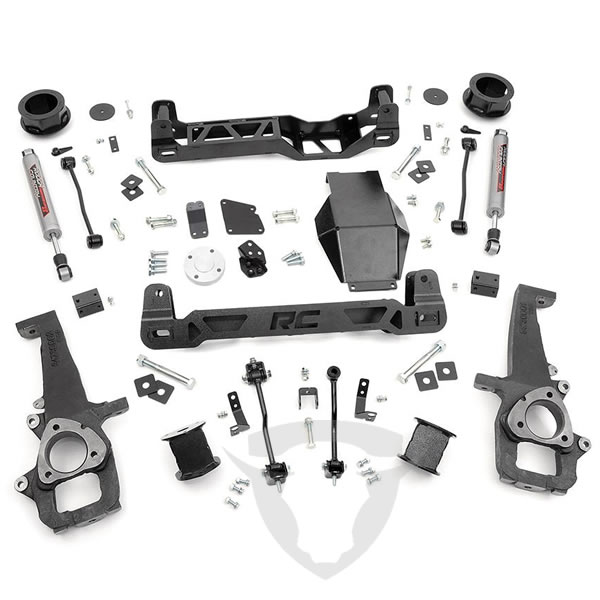 Give your 2012-up Dodge 1500 the perfect blend of performance, protection, and style with Rough Country's 4-inch Suspension Lift. Designed to offer an affordable way to maximize off-road performance and run up to 35-inch tires, these kits offer high quality, heavy-duty equipment for new model Dodge 1500’s. Utilizing heavy-duty, laser cut, steel equipment engineered by Rough Country, these 4-inch Suspension Lifts are complete kits that include everything needed for outstanding off-road performance. High-clearance front and rear cross-members provide enough room for off-road climbs and runs. A heavy-duty skid plate shields the vehicle’s differential, protecting you from hazardous terrain. A durable set of driver and passenger side lifted cast knuckles are also included, helping to promote proper geometry once the vehicle is lifted. And for true trailblazers, this kit also ships with a set of rear Performance 2.2 shock absorbers - Rough Country’s premiere shocks; valved specifically for unparalleled off-road performance. Best of all? You'll achieve better performance, bigger tires, and considerable protection all without sacrificing the look of your truck. All components are specifically designed to keep things nice and tidy underneath, utilizing drop brackets to promote proper geometry and leaving nothing hanging out in plain sight. The beefy cross members feature a laser-cut RCX logo, giving the truck a fierce, but streamlined look after lifting. Includes Rough Country's Lifetime Replacement Guarantee!